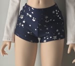 Blue galaxy hot pants with silver vinyl stars and planets, made of a stretchy cotton. Pattern will vary.