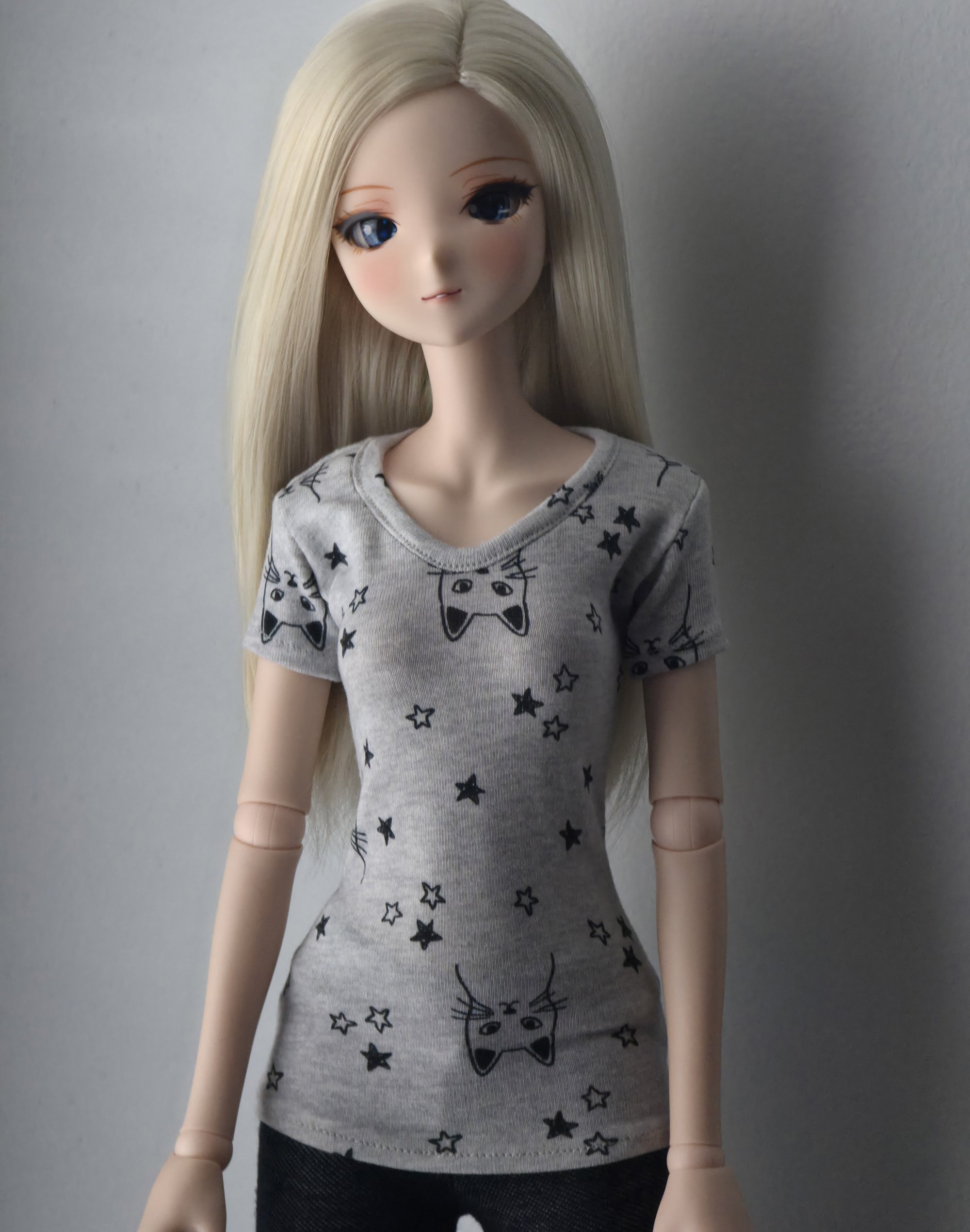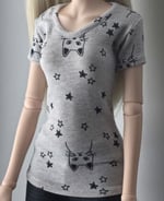 Grey tee with black cat and stars and made of a soft and stretchy cotton. Pattern will vary.